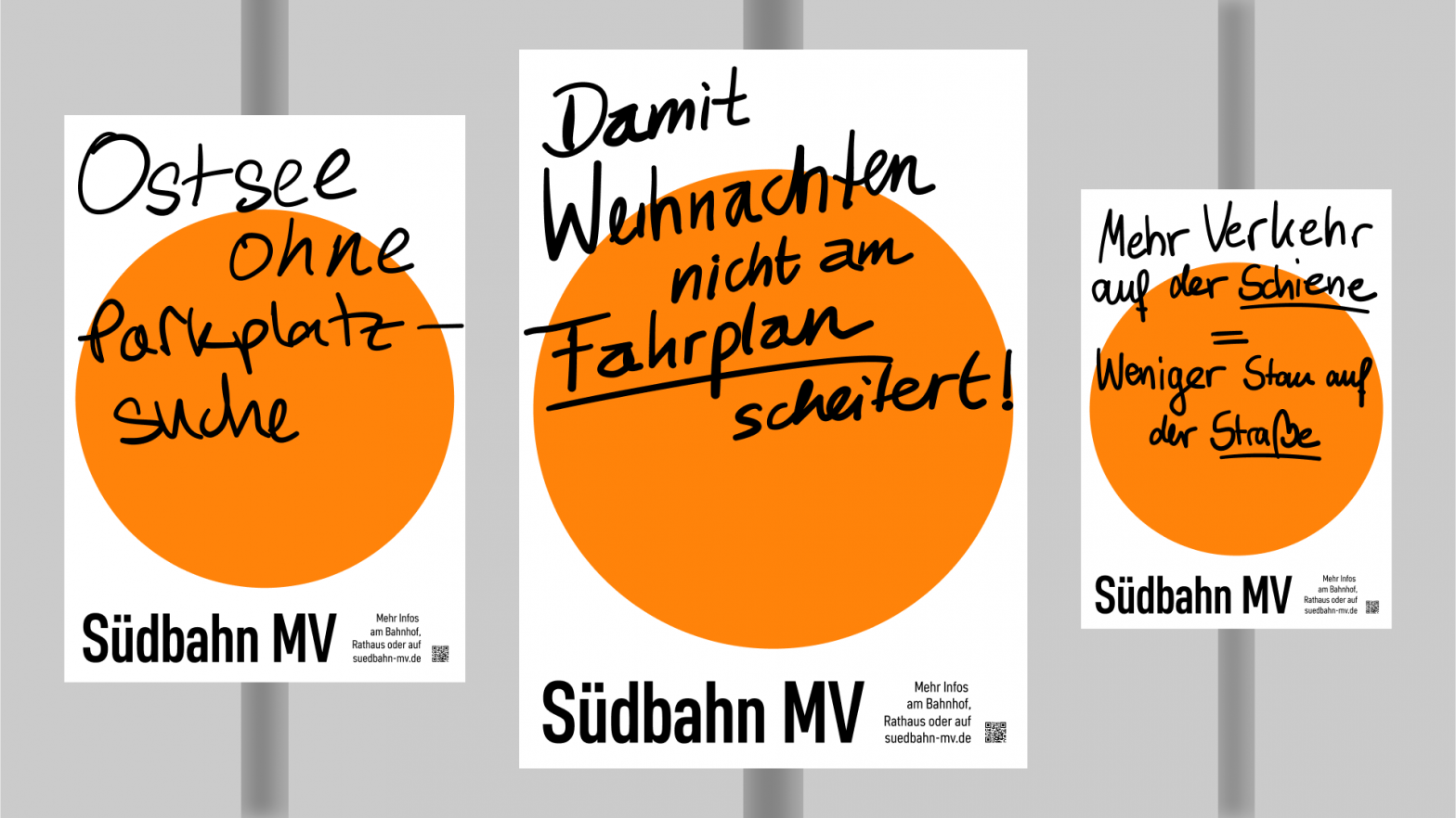 Im Rahmen meiner Bachelorarbeit arbeitete ich dann zusammen mit der Bürgerinitiative an ihrem Erscheinungsbild, ihrer Kommunikation und der gezielten Ansprache von Bevölkerung und Politik. Dabei entstand ein einheitlicher Name: »Bi Südbahn MV« und eine visuelle Identität mit Farbgebung und Symbolik. Dies wird mit einer Schrift kombiniert, welche Bahnbezug hat (FW Neue DIN) und Headlines in Handschrift, was die verschiedenen Perspektiven und Menschen der Initiative widerspiegelt.