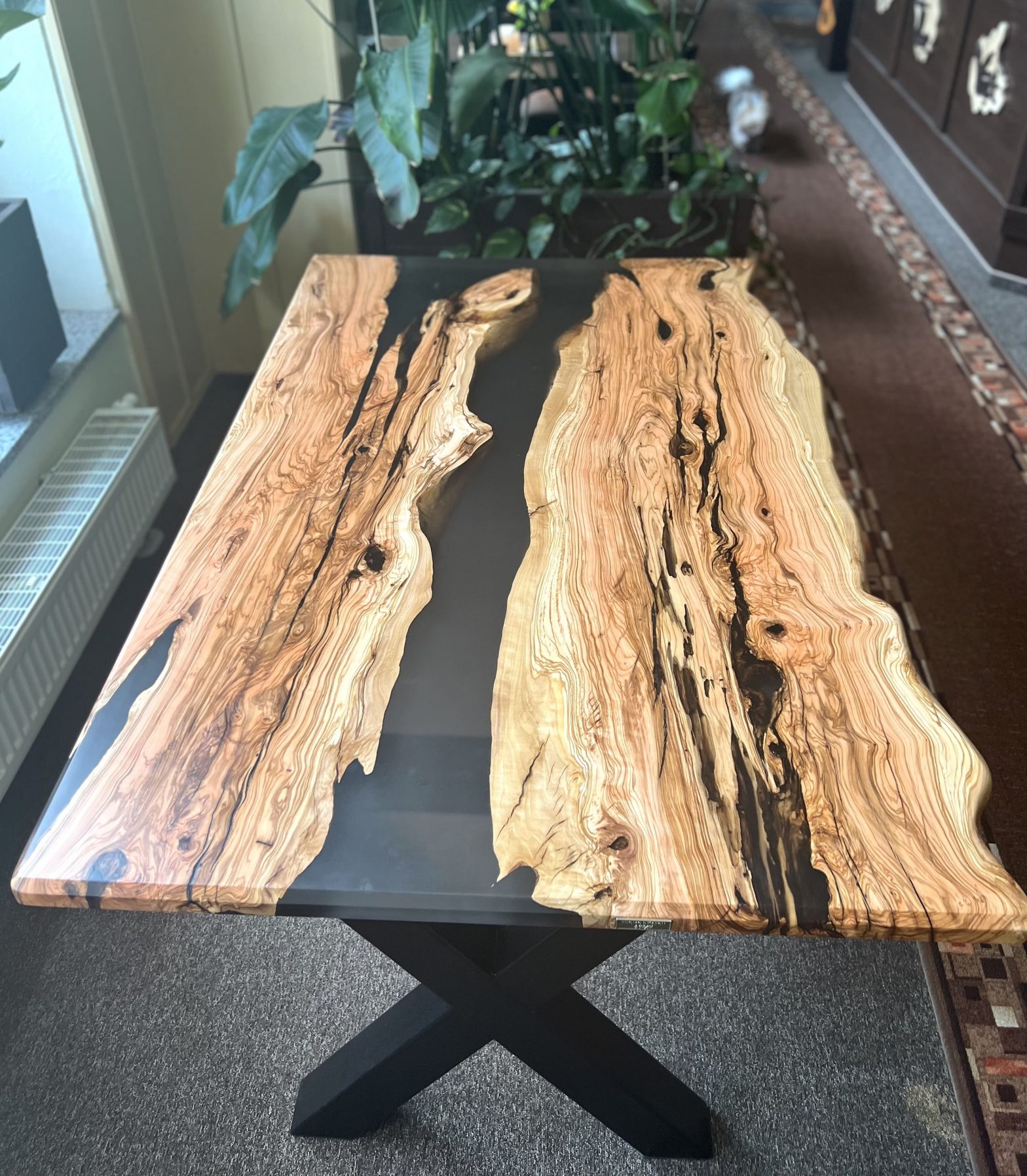 Edler & moderner Designertisch aus Massivholz, im Kombination mit eleganten schwarz eingefärbten Epoxidharz.