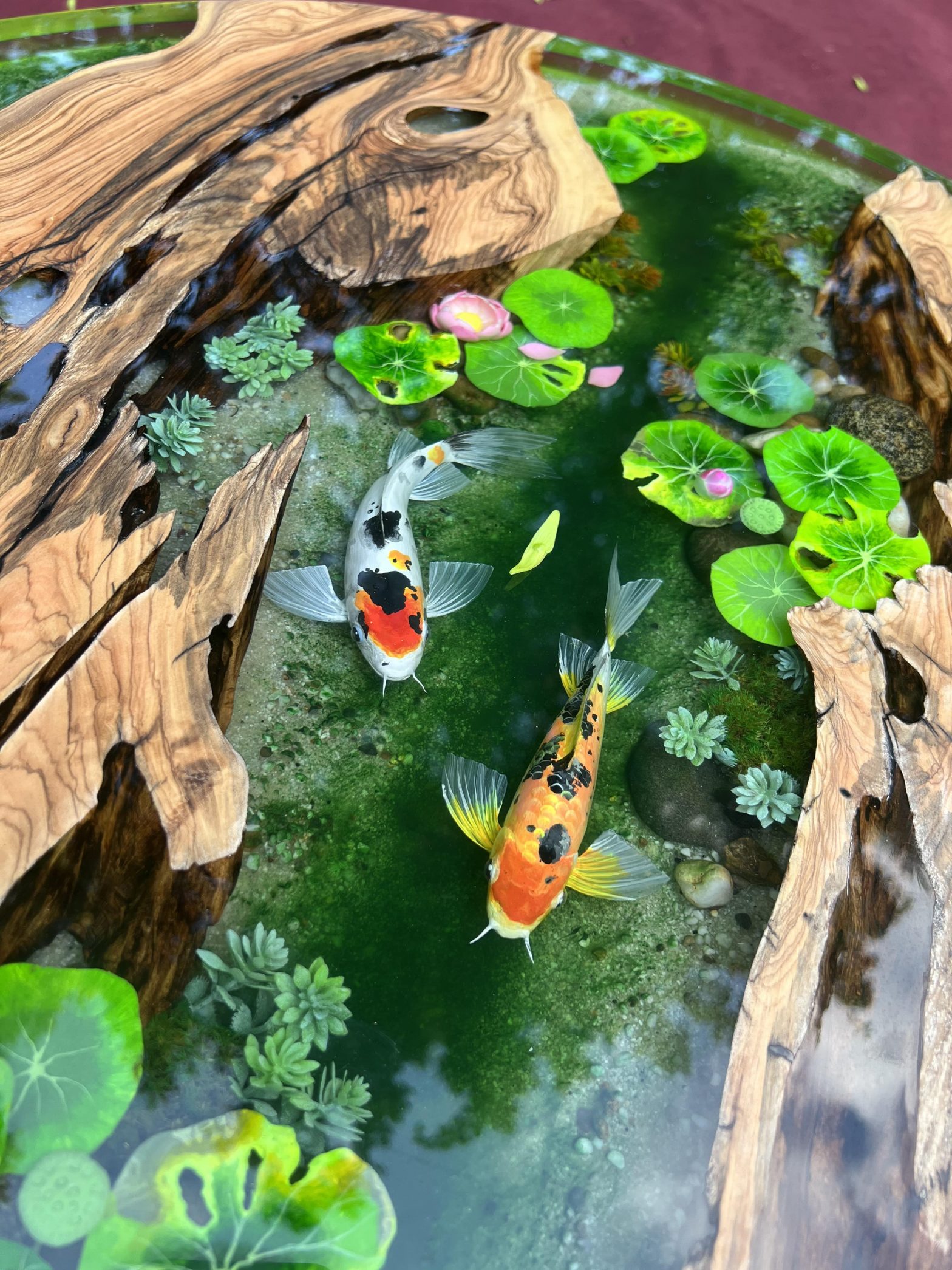 Tischplatte: Echtholz Natur mit schöner Maserung, Rissen& Löchern im Kombination mit Epoxidharz transparent im hand bemalt & gestaltetem Koi Teich (2 Koi Fische , Lotusblüten & Lotusblättern). Durchmesse: 70cm; Stärke: 4cm