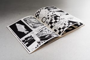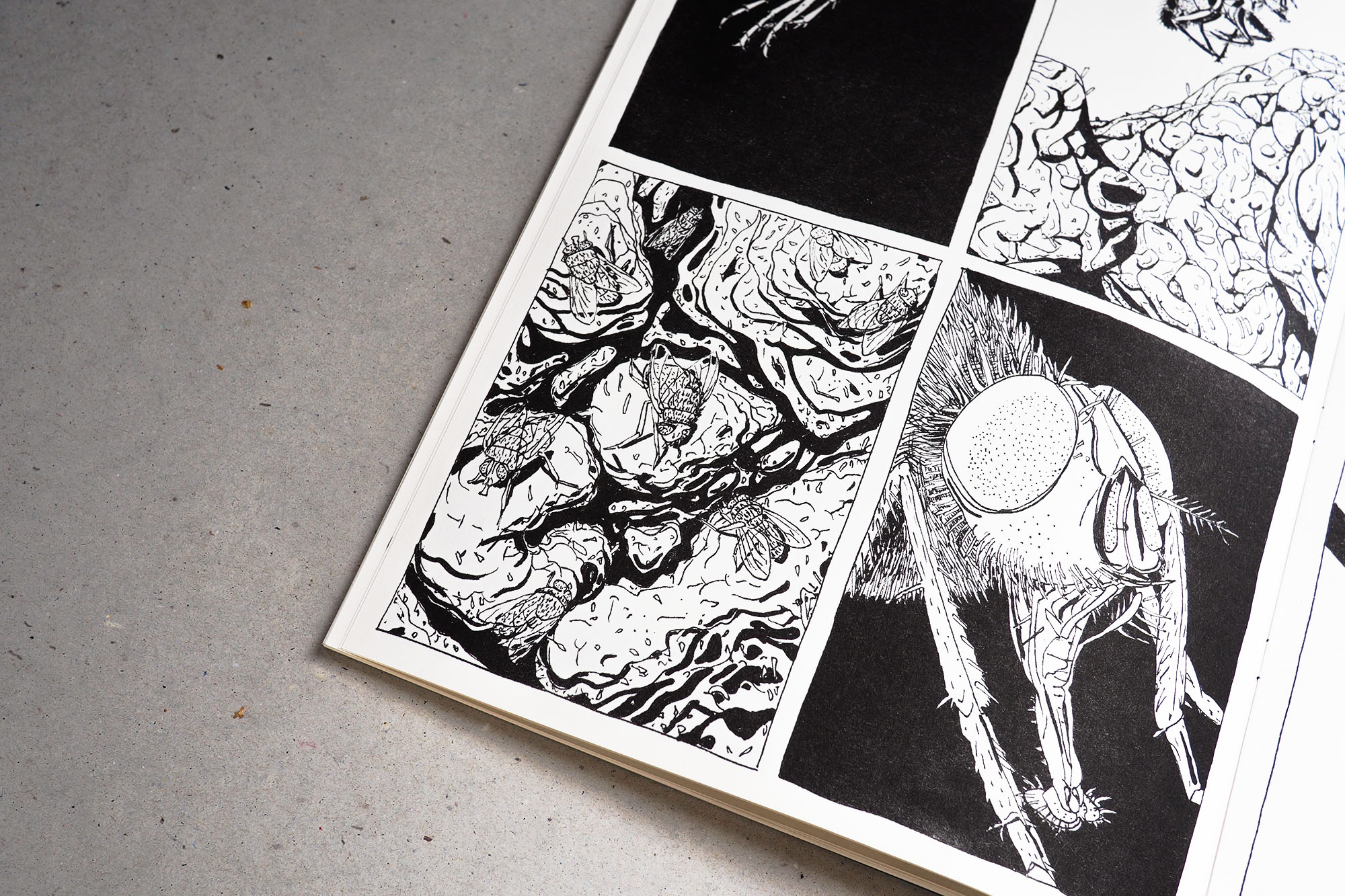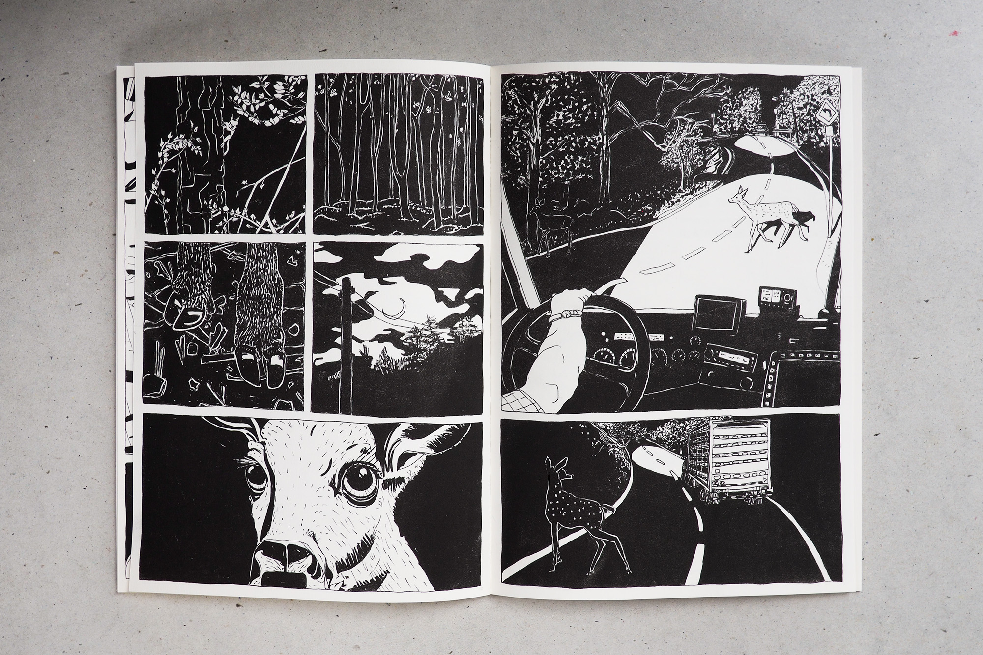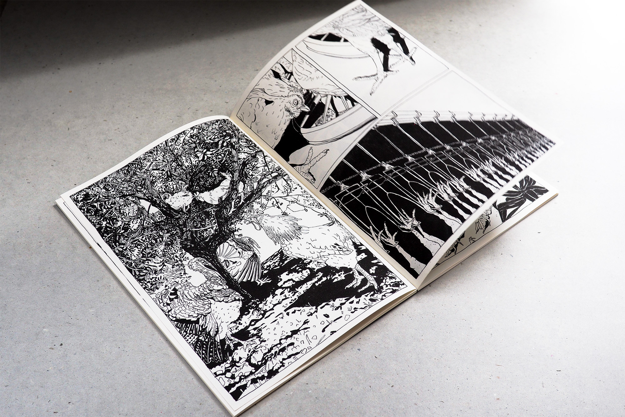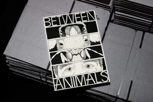 Between Animals überwindet die Grenzen der Sprache und visualisiert mithilfe von Comic-Zeichnungen Perspektiven jenseits von Worten. Jede Doppelseite zeigt jeweils eine Tierart, die mit einer in der Seitenfolge vorangehenden oder nachfolgenden Lebensraum oder Gewohnheiten teilt. Menschengemachtes ist allgegenwärtig, Menschen stehen aber nicht im Zentrum. Jedes Umblättern ergibt einen Perspektivwechsel: ein Einblick in eine mehr-als-menschliche Welt.