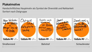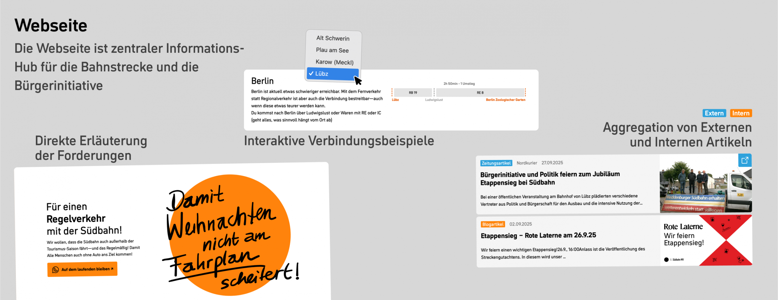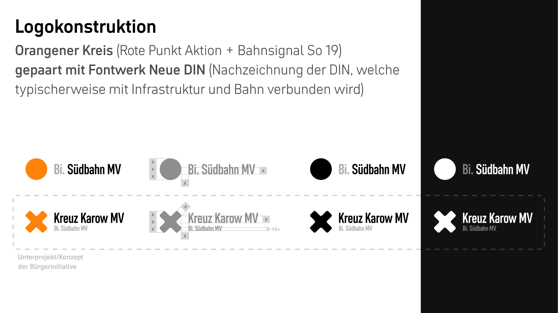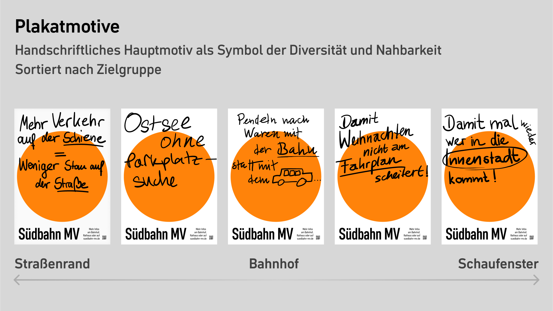 Im Rahmen meiner Bachelorarbeit arbeitete ich dann zusammen mit der Bürgerinitiative an ihrem Erscheinungsbild, ihrer Kommunikation und der gezielten Ansprache von Bevölkerung und Politik. Dabei entstand ein einheitlicher Name: »Bi Südbahn MV« und eine visuelle Identität mit Farbgebung und Symbolik. Dies wird mit einer Schrift kombiniert, welche Bahnbezug hat (FW Neue DIN) und Headlines in Handschrift, was die verschiedenen Perspektiven und Menschen der Initiative widerspiegelt.
