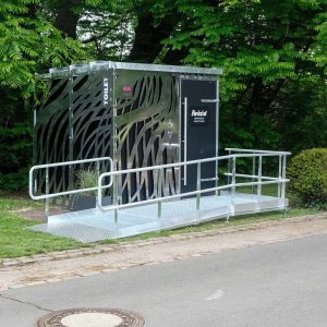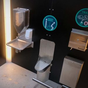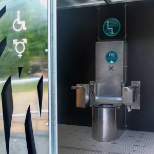 Die “Libre DIN” ist keine gewöhnliche öffentliche Toilette. Sie wurde von Finizio seit 2019 entwickelt und im Mai 2025 auf den Markt gebracht. Die Außenfassade ist ein lang erkämpfter Triumph über die Geißel jedes Stadtmobiliars – Graffiti. Das spiegelnde Edelstahlmuster wurde vom Künstler 1010 entworfen und bildet eine dreidimensionale Topografie, die konkurrierende Straßenkunst abblitzen lässt. Finizio versteht Barrierefreiheit nicht nur im Sinne des Rollstuhls. Ein Unisexurinal ermöglicht allen Geschlechtern ein einfaches Urinieren im Stehen oder in der Stehhocke. Die Libre DIN erfordert ein Fünftel der investiven Kosten gegenüber öffentlichen Toiletten, die einen Anschluss an Abwasser, Trinkwasser und Strom benötigen. Letzteres produziert sie per Solaranlage selbst und versteht menschliche Ausscheidungen als Ressource, die Sie zum Dünger der Zukunft werden lässt.