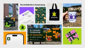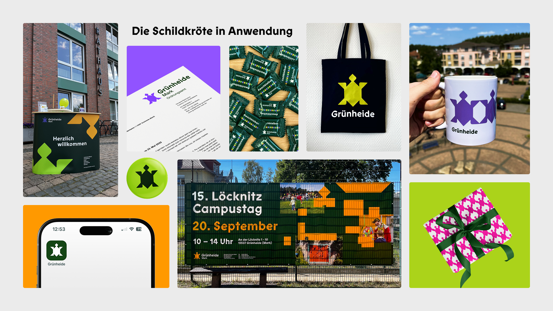 In Anwendung ergibt sich aus der Schildkröte als Gestaltungsidee ein flexibler Baukasten, der digital wie analog authentisch Grünheide ist.