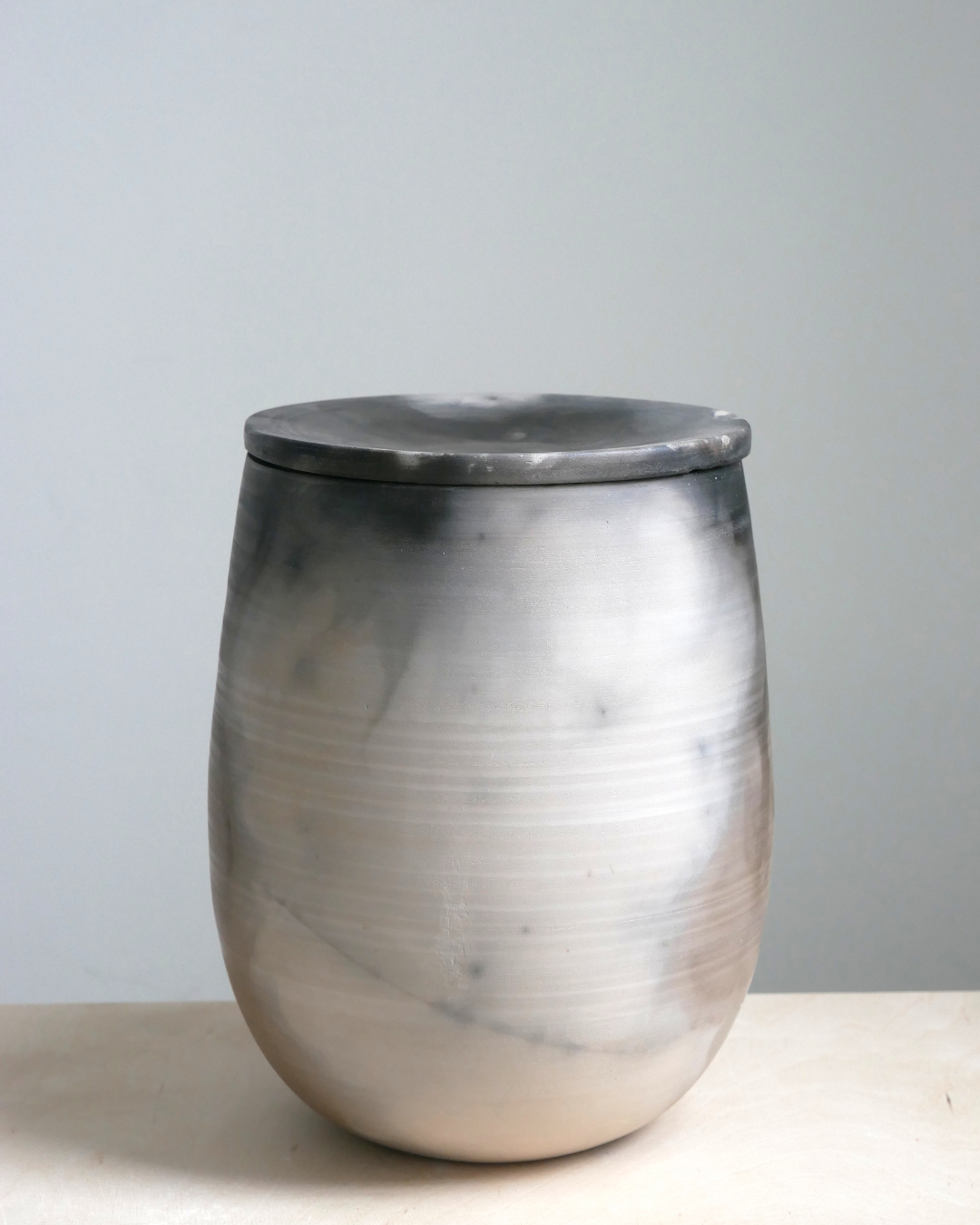 Zum Schluss – Die Urne als singuläres Objekt Der gegenwärtige Umgang mit Tod, Trauer und Bestattung ist geprägt von der gesellschaftlichen Transfor‐ mation, die sich in der Bestattungskultur durch Pluralismus und Individualität ausdrückt und zugleich im Wandel ist. Die Antwort in einer hoch industrialisierten und digitalen Gesellschaft ist, die Urne als singuläres Objekt zu sehen, um dem Bedürfnis nach Individualität in dem Prozess gerecht zu werden. Die Urne ist die letzte Gestalt, in der Eigenschaften, Leidenschaften und das Leben des Verstorbenen projiziert wer‐ den. Die Arbeit verfolgt das Ziel einer zeitgemäßen Interpretation des archetypischen Gefäßes. Seit je her ist die Verarbeitung des Rohstoffs Ton und dessen Brennen im freien Feuer ein stetiger Begleiter der Menschheit, unserer Geschichte und Entwicklung. Durch die manuelle Herstellung und das archaische Brennverfahren des Rauchbrand entstehen nicht reproduzierbare Unikate. Die Spuren des Feuer und Rauches hinterlassen unvorhersehbare und zufällige Oberflächengestaltung.